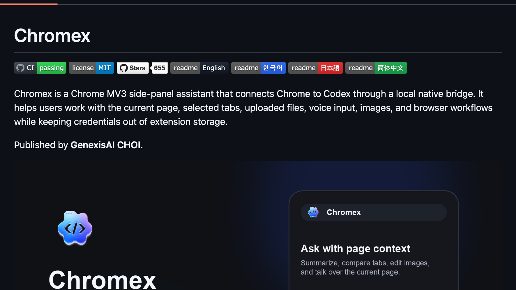 Most browser AI extensions still feel like chat overlays with a tab picker. Chromex is more interesting because it treats Chrome as a real multimodal workspace for Codex, with page context, files, voice, and browser actions behind a local bridge.
